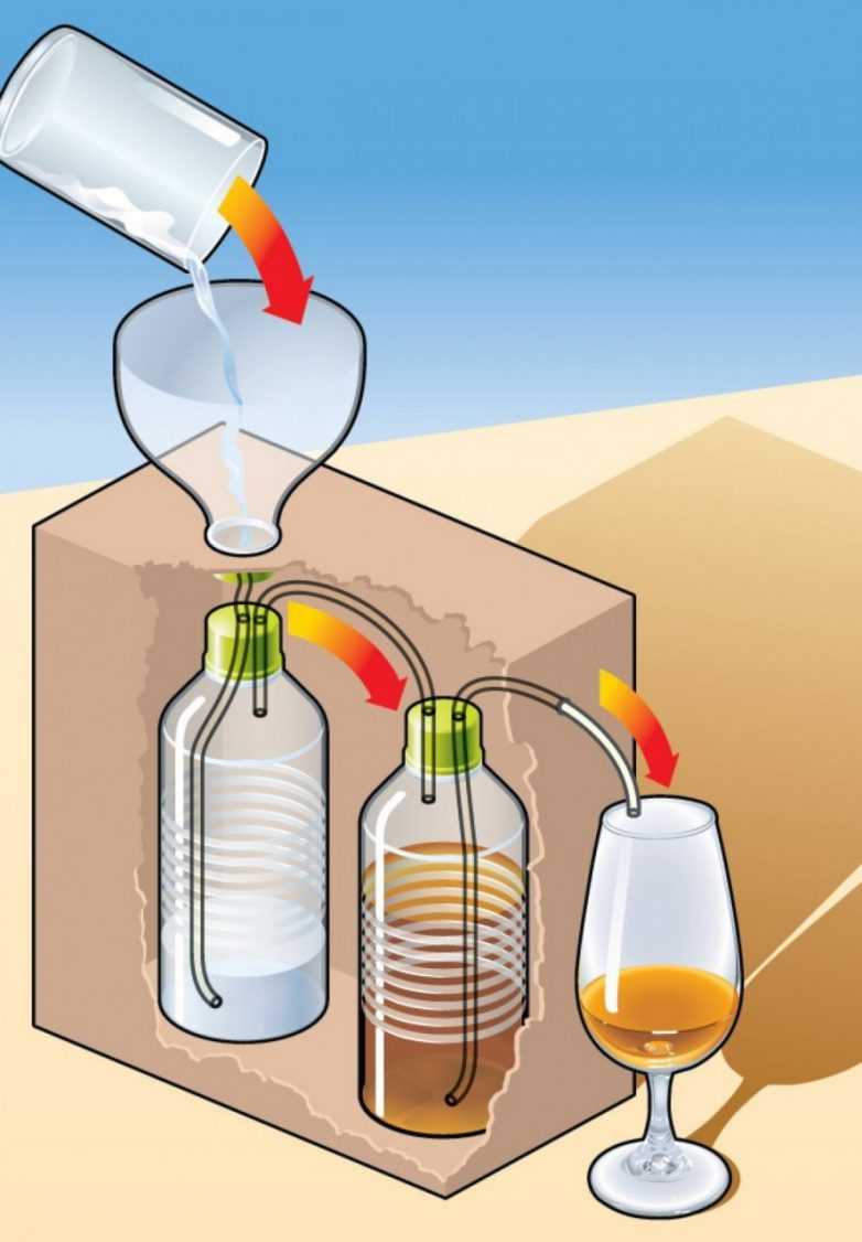 3. Помести “механизм“ в коробку. Наливай воду в лейку. Если все получилось герметично, то воздух вместе с водой через трубки будет выталкивать вино в крайнюю точку, то есть в бокал. Гости будут в шоке: в один “конец“ наливаешь “кран-колу“, из другого вытекает настоящее вино.