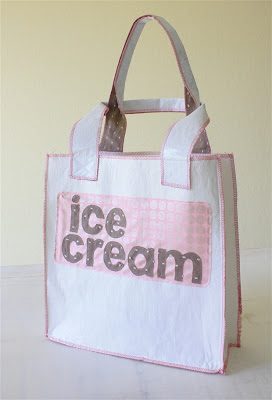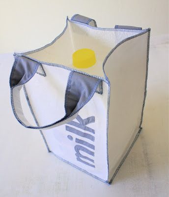 Ну и переходим непосредственно к изготовлению хозяйственной сумки. Я пробовала сделать подобную ткань из трех тонких пакетов — шикарная по плотности структура получается, здесь же еще плотнее, сумка будет очень практичной. Обратите внимание, автор предлагает ручки дополнить обычной тканью. Ну и нашивает красивую аппликацию в тон ткани для ручек:)