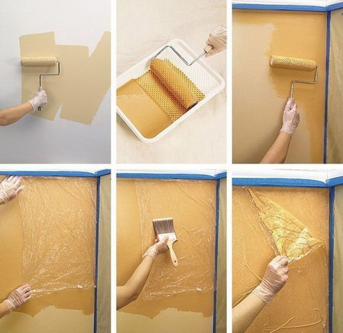 А для создания такого, я бы сказала мраморного эффекта, тебе понадобится обычная пищевая пленка. Нанеси краску плотным слоем на подготовленную стену и с помощью клеенки и кисти создай оригинальные узоры.