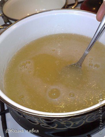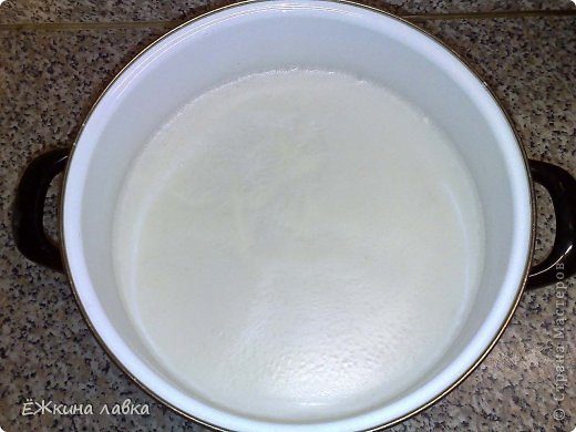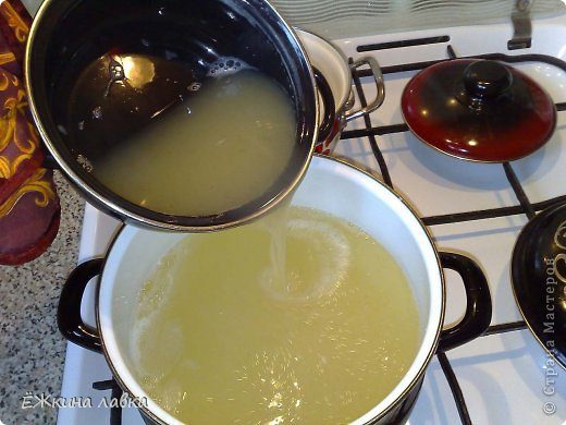 5 — Вторую кастрюльку, желательно взять литра на 3, чтобы потом удобно было в ней перемешать полученный гель. В этой кастрюльке подогреваем ещё 1 литр воды и…