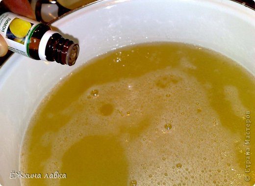 9 — В последнюю очередь накапаем 10 капель эфирного масла лимона. Не пугайтесь такого жёлтого цвета, когда гель остынет, он станет белым)))