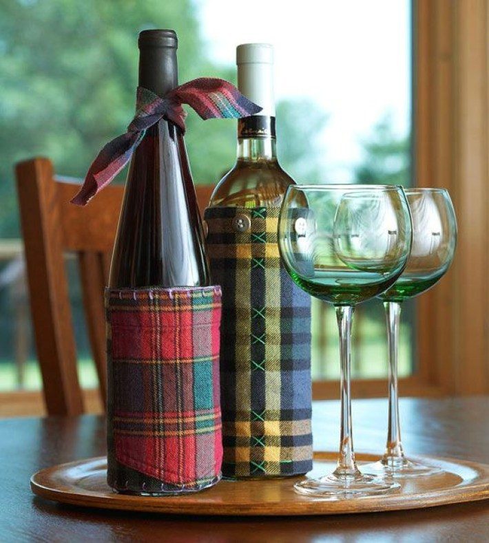 Для подарочной бутылки вина можно сшить красивый и уютный чехол из фланелевой рубашки.