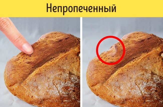 Хорошо пропеченный хлеб из качественной муки легко восстанавливает форму. Попробуйте надавить на него и проверьте, осталась ли вмятина. Если да — хлеб недопекли.
