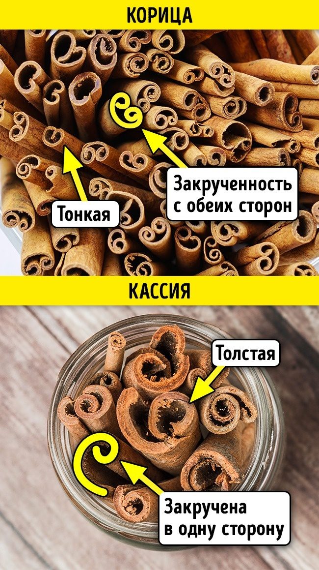 За корицу очень часто выдают кассию — они похожи, но кассия обладает менее выраженным ароматом. Кроме того, палочки кассии более толстые и грубые и закручены спиралью преимущественно с одной стороны.
