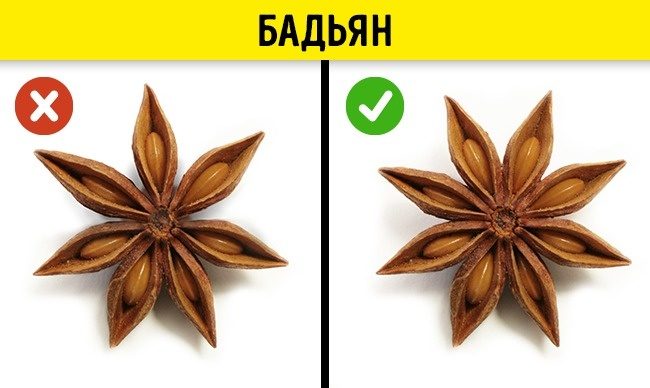 Бадьян по запаху похож на анис, имеет красно-коричневый цвет. Лучиков, содержащих блестящую косточку, должно быть 8. Свежий бадьян при повреждении выделяет немного маслянистой жидкости. Если звездочки слишком ломкие либо слишком темного цвета — это некачественное, старое сырье.