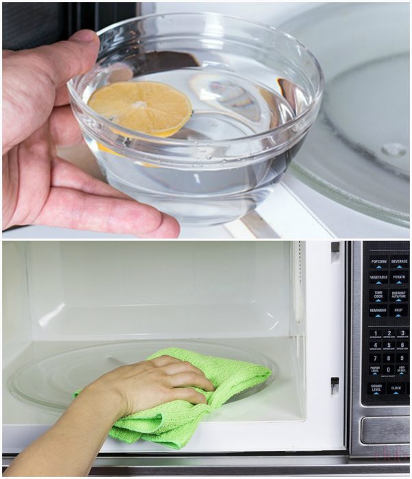 Небольшой заветренный кусочек лимона можно использовать для чистки стенок микроволновки от старого жира. Просто наполните небольшую миску водой с добавлением небольшого количества лимонного сока, поставьте в СВЧ и подогревайте в течении 3-5 минут на максимальной мощности. За это время вода закипит и образует на стенках конденсат, который нужно вытереть тряпочкой вместе со всеми загрязнениями.