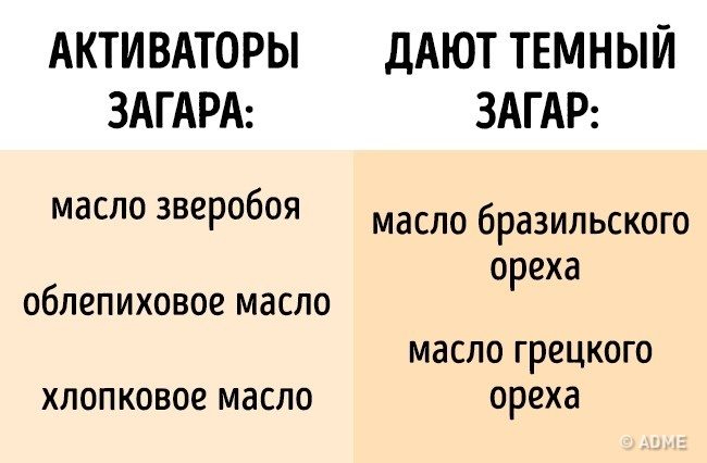 Масла не следует использовать в чистом виде, так как они могут вызвать сухость или раздражение кожи. Наилучший вариант — соединить их с оксидом цинка или диоксидом титана (продаются в любой аптеке в виде порошка). Это отличные фильтры с отражающим солнечные лучи барьером. Добавляйте один из них в масло (или смесь нескольких масел с активаторами загара) в количестве 1:10 (например, на 1 стакан масла 2 ст. л. порошка), перемешайте до растворения — вот и весь рецепт безопасного и красивого загара.При этом не забывайте, что с любой защитой не стоит злоупотреблять времяпрепровождением на солнце. Приятного отдыха!
