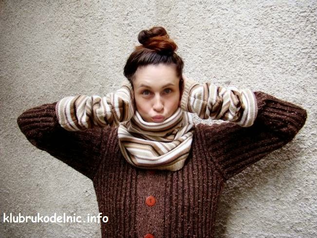 «На этой неделе ко мне пришла подруга и мне очень понравились ее красивые и модные гетры и „нарукавники“, которые прекрасно дополняли ее костюм. Когда я стала хвалить, она с улыбкой сказала, что сшила их из старого свитера, который уже давно собиралась выбросить, да все откладывала (наверное это знакомо и вам :)). К тому сделать это совершенно просто: отрезала рукава и подшила края. Зачем вязать, когда за пол часа все было готово!
