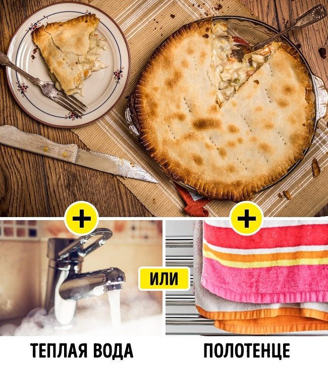 опустить форму в теплую воду, чтобы она окутывала дно, или завернуть форму в холодное полотенце.