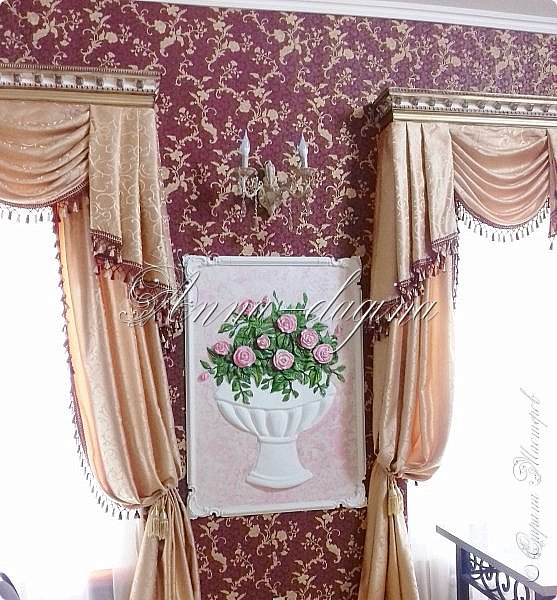 У меня гардина висит ниже потолка и спускаясь по лестнице со второго этажа виден верх гардины, поэтому я его декорирую обоями.