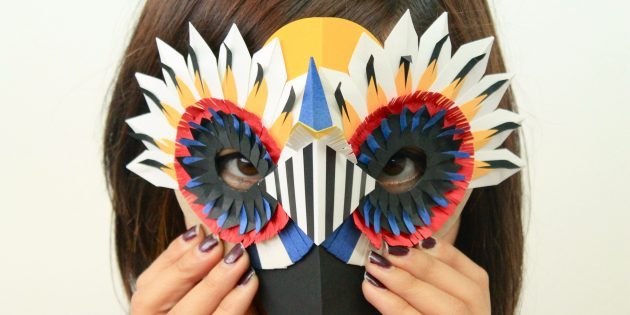 Также сове нужна маска с клювом. Можете сделать простой вариант из картона или сложные маски из бумаги. Вот несколько примеров разноцветных фантастических масок: