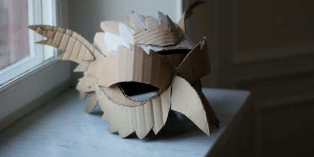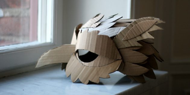 Следующий важный момент — маска. На фото ниже показан вариант красивой картонной маски грифона. Сначала вырежьте части, а затем склейте их вместе и раскрасьте.
