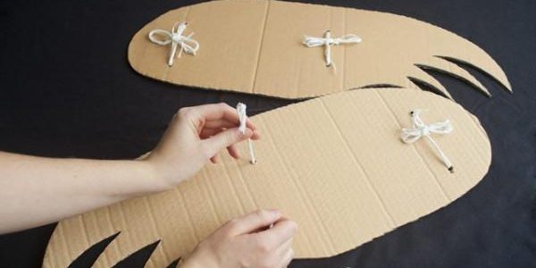 Сделайте отверстия в крыльях, проденьте красный шнурок, как показано на картинке ниже, и заклейте скотчем. В получившиеся петли ребёнок будет продевать руки.