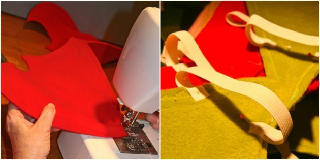Прошейте крылья по контуру, а потом вокруг каждой «кости». Затем пришейте резинки, чтобы ребёнок мог надеть крылья.