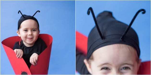 Костюм состоит из крыльев и шапочки с усиками, остальная одежда — на ваше усмотрение. Это может быть футболка со штанами или юбкой или нарядное платье. Главное, чтобы они были чёрными или красными в чёрную точку.