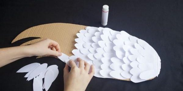 Чтобы сделать крылья, нарисуйте на бумаге шаблон с острыми, рваными краями-перьями. Затем сделайте ещё два шаблона для других слоёв, каждый уже предыдущего. Переведите шаблоны на фетр, вырежьте крылья и сшейте их между собой, поместив более тёмную ткань между слоями светлой.