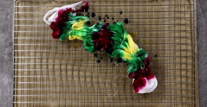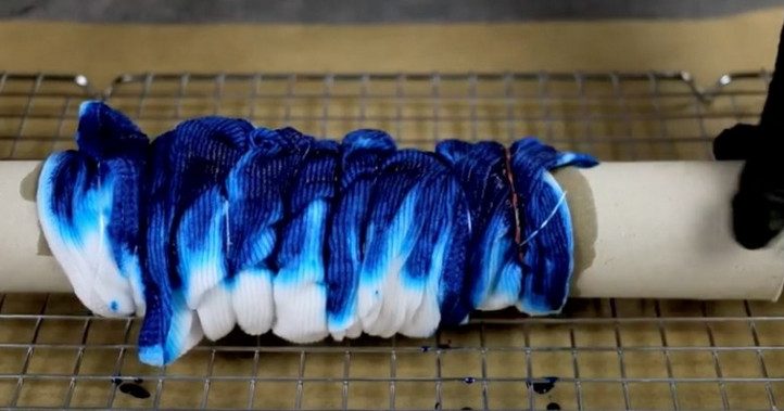 Когда «колбаса» упакована, нанеси краску выбранного цвета на ее сегменты. Сначала с лицевой стороны, потом переверни на обратную. Окрашенную вещь положи в пластиковый пакет, пусть краска закрепится на ткани. Оставь на 6-8 часов. Затем промой под проточной водой, пока вода не станет чистой, потом постирай в машинке.