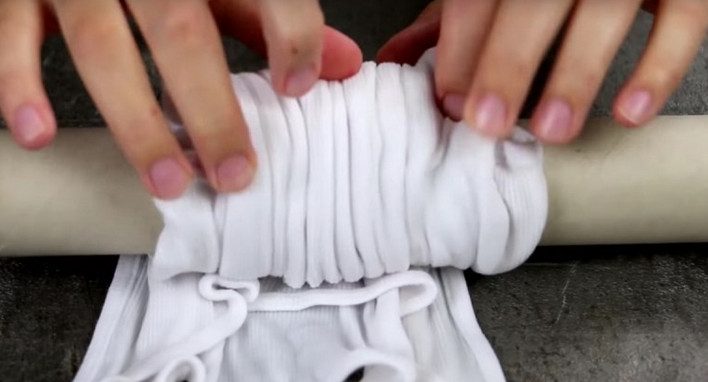 Оберни футболку вокруг втулки. Закрепи края резинками. После этого туго намотай по спирали нить.