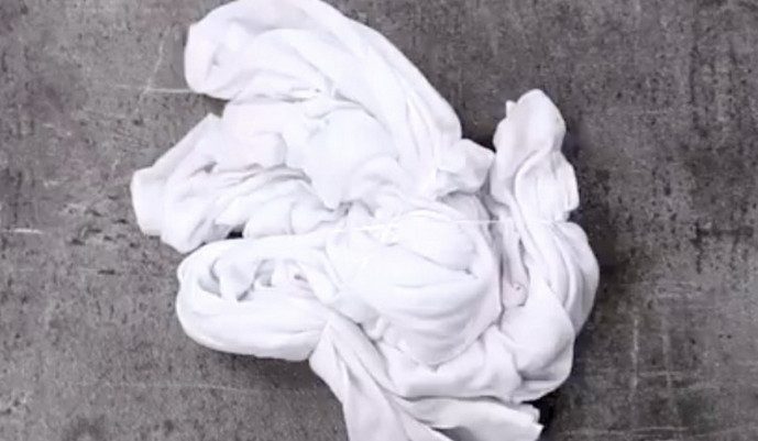 Разверни футболку перед собой. Приподними пальцами за центр и начинай вращать по часовой стрелке (или против) пока футболка не станет походить на сплющенный диск.