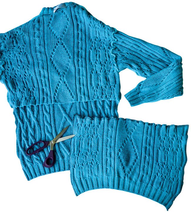 Исходная деталь — прямоугольник: от нижнего края пуловера отложить вверх 28 см, поставить метку. Через эту метку провести линию, параллельную линии низа, и разрезать перед/спинку пуловера по этой линии, распоров боковые швы. Срезы обметать. Деталь сложить лицевой стороной вовнутрь и стачать бывшие боковые швы пуловера.