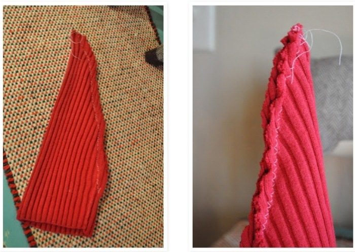 Такая елочка станет украшением рабочего стола, ее можно расположить и на полочке возле зеркала, и среди книг, словом, где душа пожелает. Чтобы сделать елку, понадобится старый свитер и картонный конус. Отрезается ткань нужного размера, сшивается, надевается на конус, а края фиксируются с внутренней стороны при помощи горячего клея. Модный новогодний декор готов!