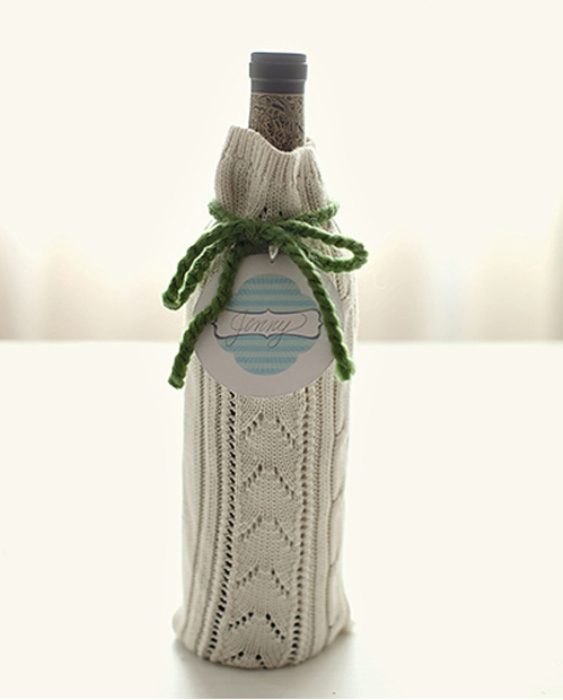 Кто сказал, что бутылка вина не может быть полноценным подарком? Вполне! Если упаковать ее в текстильный мешочек, то выглядеть она будет очень празднично. Упаковку советуем делать из рукава свитера, низ – из любого кусочка ткани. Вначале нужно сделать замеры, затем пришить круглое основание с изнаночной стороны, вывернуть, поместить внутрь бутылку вина и украсить шнуроком.