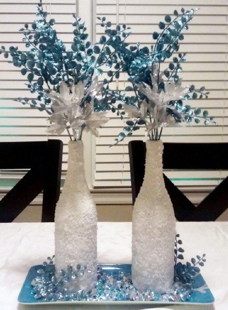 Таким же образом можно украсить любые стеклянные емкости. Можете сделать милые заснеженные подсвечники или же просто обвалять елочные игрушки. Если хотите сочетать в композиции несколько цветов, используйте разноцветную морскую соль.