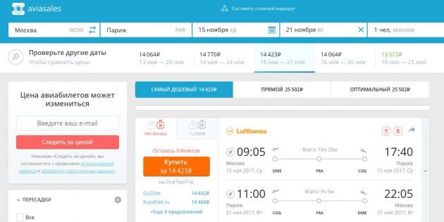 И конечно, пользуйтесь агрегаторами дешёвых авиабилетов, такими как Aviasales, Skyscanner, Momondo, OneTwoTrip. Они не привязаны к конкретной авиакомпании, а сравнивают цены с разных сайтов и выдают вам оптимальный вариант. А ещё в этих поисковиках есть удобные графики и календари цен. С их помощью можно сдвинуть дату поездки и сэкономить значительную сумму.