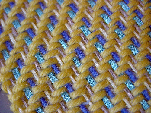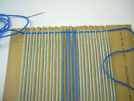 Начинаем ткать. Вместо ткацкого челнока будем использовать обычную иголку. Протяните другую нить между всеми поперечными рядами.
