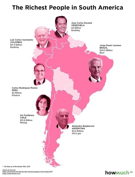 В Северной Америке лидером стал Джефф Безос с состоянием в 92,6 миллиарда долларов (сфера деятельности: технологии, Amazon.com), в Южной Америке – Жорже Пауло Леман с состоянием 30,8 миллиарда (еда и напитки, Anheuser-Busch InBev), в Европе – Амансио Ортега – 77,8 миллиарда долларов (мода, инвестиции и недвижимость, Zara). В Азии лидером стал Мукеш Амбани с состоянием в 41,9 миллиарда долларов (нефтегазовая отрасль, Reliance Industries), в Африке – Алико Данготе с состоянием в 13,7 миллиарда (цемент, сахар, мука, соль, Dangote Cement), в Австралии и Океании – Джина Райнхарт с состоянием в 16,6 миллиарда (горнодобывающая промышленность, Hope Downs). Наконец, богатейшим человеком Антарктиды назвали Арнольда Дональда (Carnival Corporation), состояние которого насчитывает меньше 100 миллионов долларов. Зарабатывает он на организации путешествий.