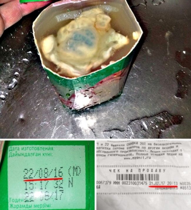 На фото просрочки подчеркнута дата изготовления 22.08.2016, дата на чеке 21.02.2017, продукт годен до 22.06.2017.