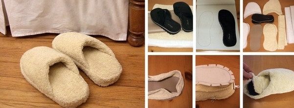 На фотографиях показано как превратить шлепки в теплые тапочки, используя махровое полотенце.