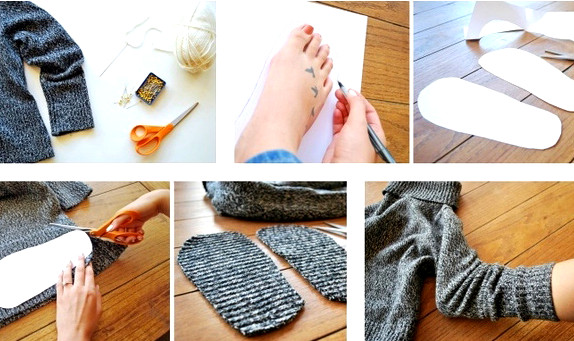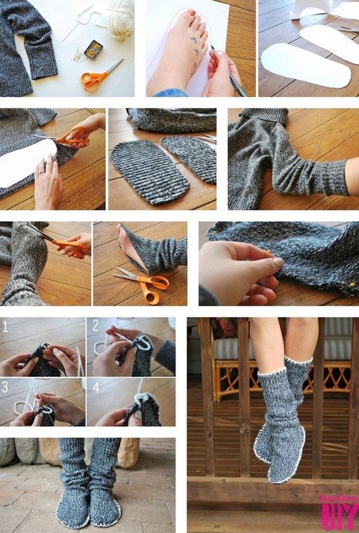 Имея старую кофту и пару резинок для волос, можно сделать подобные тапочки.