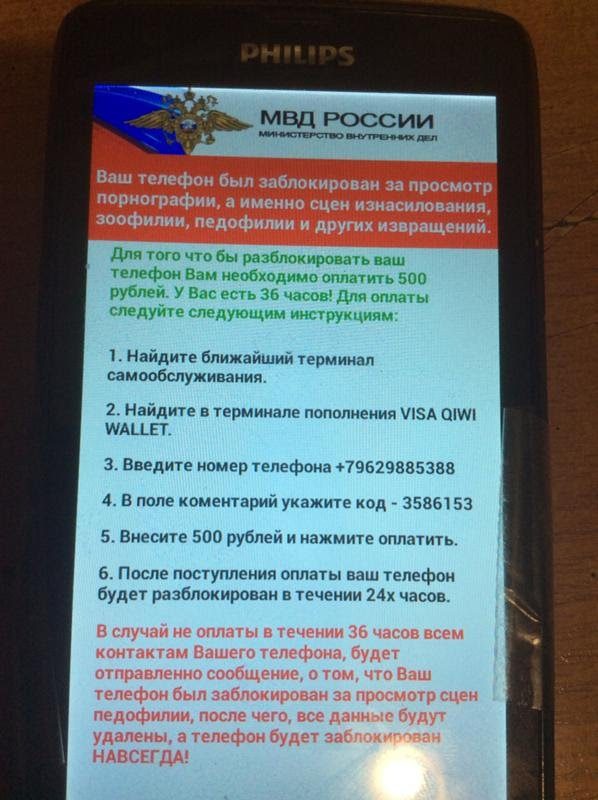 На вашем смартфоне или планшете вдруг появляется угроза во весь экран, что устройство заблокировано МВД или ФСБ за просмотр запрещённых сайтов, и что вы должны заплатить такую-то сумму штрафа в течение суток-полутора. В противном случае оно будет заблокировано навсегда, все данные утеряны, а вас привлекут по уголовной статье, например, за педофилию. Гаджет при этом чаще всего действительно перестаёт на что-либо реагировать.