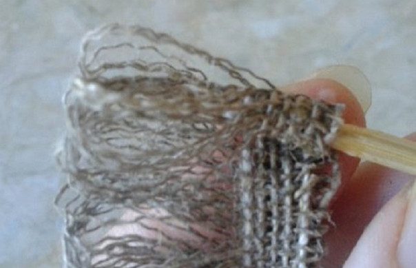 начинай вытягивать нити из плетения по бокам ткани как изображено на рисунку