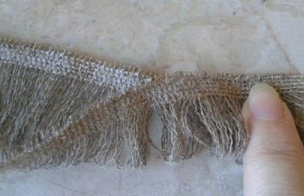 Берем клей ПВА и немного наносим на края мешковины и складываем полоску по полам