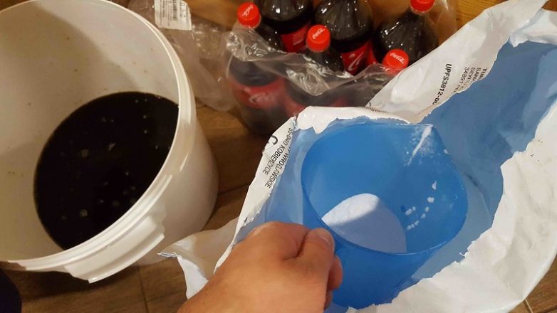 Для начала сливаем всю кока-колу в емкость для брожения, предварительно обеззаразив ее и гидрозатвор. Обязательно дождитесь, чтобы все газы вышли и только затем добавляйте глюкозу (декстрозу), либо сахар. Если, Вы конечно, решите ничего не добавлять, то будьте готовы к тому, что выход готового продукта будет крайне мал. Из 24 литров получится всего 2 литра водки. Добавив декстрозы, выйдет в два раза больше. Если вы начнете засыпать что-то до того, как выйдут газы, то случится извержение колы за пределы емкости. Будьте к этому готовы!