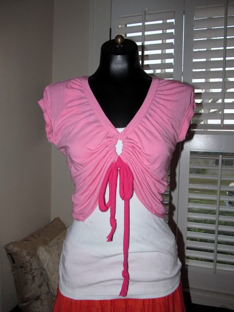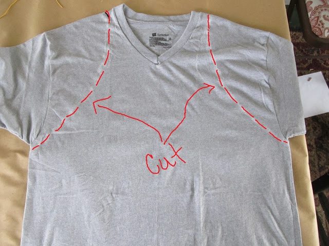 Разрезаем футболку вдоль красной пунктирной линии, вырезая воротник, подгибаем, пускаем строчку и затем пропускаем шнур, затягивая по фигуре :) Вот и все :)