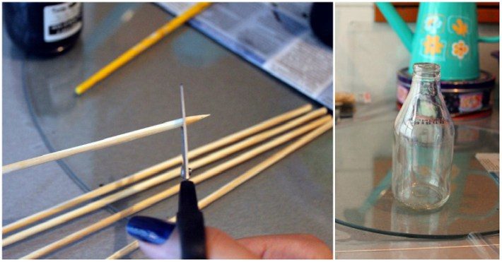 У бамбуковых палочек отрежь острые кончики и слегка разомни, чтобы получилось подобие щеточки. Вставь палочки в емкость с маслом щеточками вниз (так жидкость будет лучше впитываться). От количества вставленных палочек будет зависеть интенсивность аромата: чем их больше, тем запах будет сильнее.