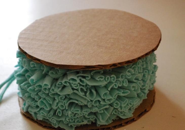 Придерживая заготовку помпона сверху, разрежьте намотанную ткань между шаблонами. Лучше использовать заточенные ножницы с острыми кончиками. Закругленные кончики не так удобны в работе в данном случае.