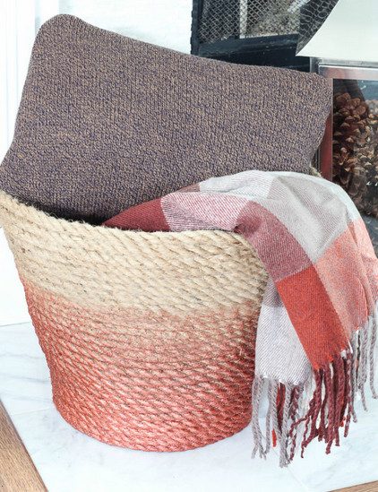 Гостиные людей, которые очень любят уют, напоминают магазин домашнего текстиля во время распродажи. Поэтому и хранить их можно, как в магазине! Небольшая веревочная корзина, покрашенная металлизированной краской — отличный вариант. Ее можно полностью наполнить пледами, создав сверху красивую драпировку.
