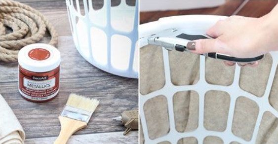 Хранить подушки и пледы можно не только в шкафу, но в красивой удобной корзине, которая отлично будет смотреться в любой комнате. Ее можно сделать самостоятельно из самой простой корзины для мусора и веревки.