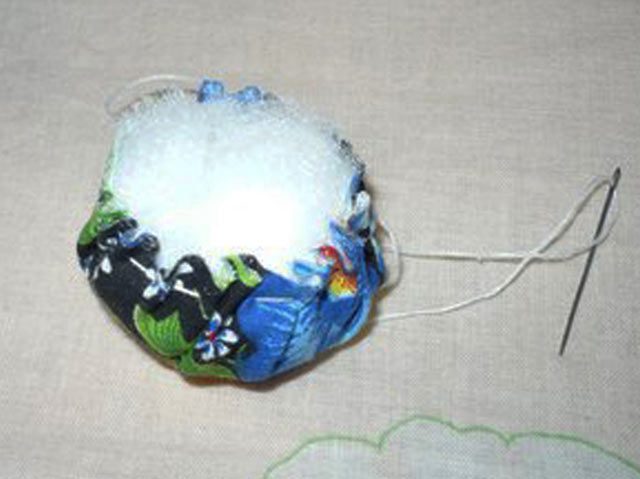 Из любой прочной ткани типа плащевки нарезается с помощью шаблона немалое количество кружков. Внутрь каждого вложим кусок синтепона и, прошив ниткой по диаметру, стянем. Получится такой вот упругий мячик. Нитки, естественно, используем капроновые.Затем шарики сшиваем между собой, прикрепляя каждый новый несколькими прочными стежками к предыдущими. Можно рядами, спиралью, в произвольном порядке… Такие «пупырчатые» коврики очень любят дети — по ним приятно ходить босиком.