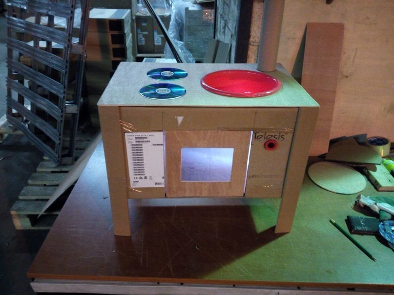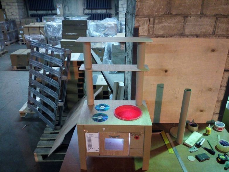 Взял я коробку из под приборов, уголки из толстого картона, их ставят на углы товара чтоб лентой коробку не замять. На фото видно, на заднем плане, полета стоит)) Прилепил скотчем на время, чтоб присмотреться. Вырезал отверстие под будущую духовку и по размеру фанеру, внутри и снаружи (фото не все, затерялись половина).