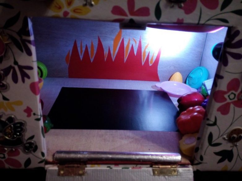 Подумав, внутри вырезал по всем бокам фанеру, посадил на жидкие гвозди, наклеил огонь, так будет крепче и красивей))) Поставил с верху отверстия магнит для дверок, чтоб закрывалась и лучше держало. Дверцу крепил как в голову пришло, каждый по своему усмотрению делает.