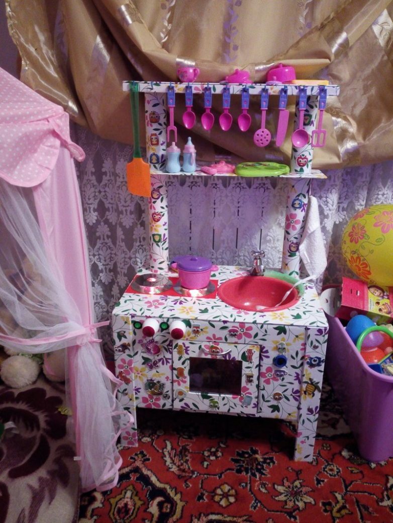 Решил я сам придумать и сделать ей кухню из подручных материалов. Работаю на складе, но этот материал можно найти во многих местах, попросить или купить по дешёвке. Этот пост не хвалиться, а может кому пригодится))) Размер кухни получился: высота 92 см. ширина 52 см. глубина 36 см.