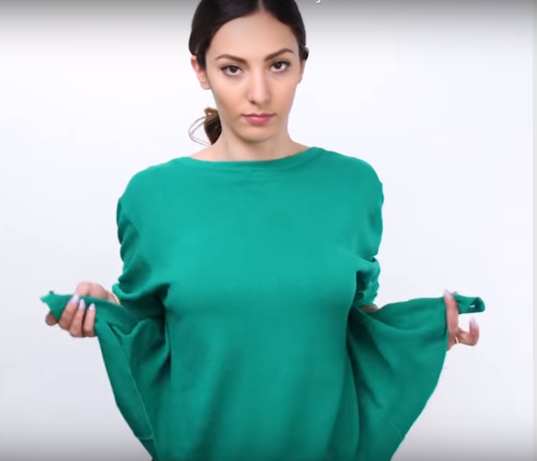 Наденьте свитер, как платье. Перекрестите рукава и закрепите булавками.