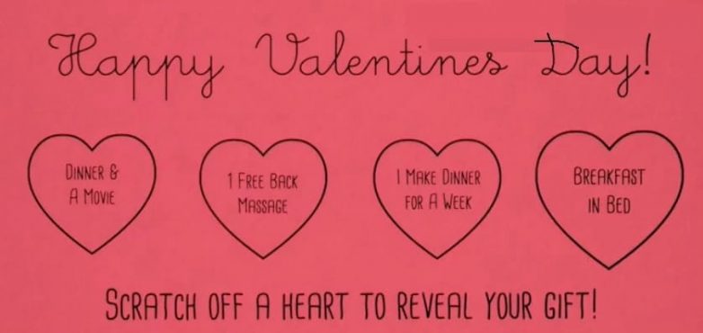 Нарисуйте или напечатайте на листе плотной бумаги текст. Например: “С Днем святого Валентина! Сотри любое сердце и узнай, какой подарок тебя ждет!” Варианты подарков могут быть любые, какими вы хотите порадовать любимого человека.