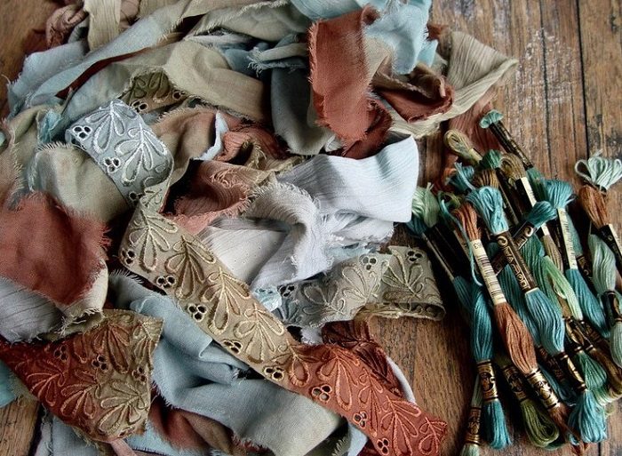 Далее необходимо достать рубашку из тазика за воротник так, чтоб при отжиме получился жгут по длине всей рубашки (с прижатыми рукавами). В таком положении рубашку нужно разложить по всей длине, чтобы ее ее части попали в контейнеры, где смешаны цвета.После этого нужно тщательно прополоскать рубашку до чистой воды и повесить ее сушиться. Далее переходим к эксперименту в технике «боро». Для него тебе понадобятся хлопчатобумажные лоскутки шириной 70 сантиметров разной длины. Я использовала кусок старой простыни и жатую ткань (что-то типа плотной марлевки). Замочи ткань в воде, по аналогии с рубашкой, отожми и по очереди опусти в краску.