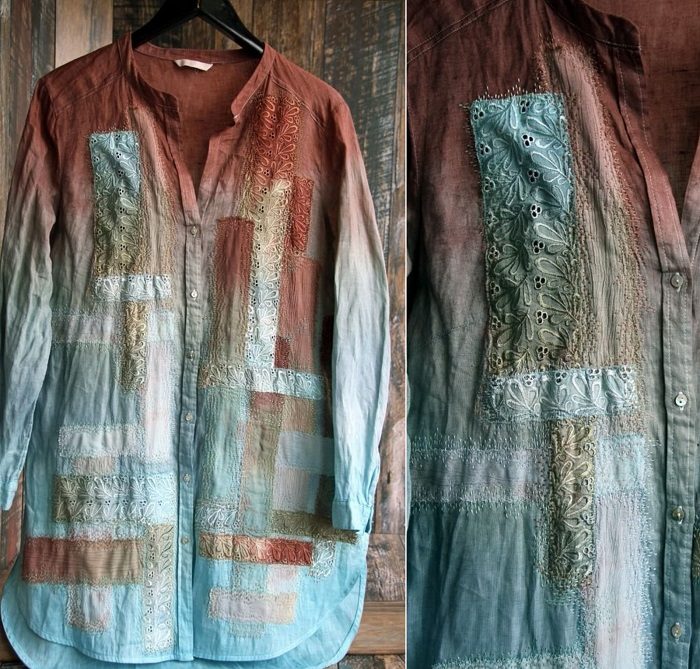 можно стем же эффектом, но гораздо проще: секционное крашение рубашки в одном и том же цвете, но будет разный оттенок. не менее красиво. И техника «боро»-это не совсем так: стежки должны быть одинаковые, плотные и только в долевом направлении. Это не русская штопка. А так- хорошо получилось. В городе можно, в селе- будут камни бросать вслед.